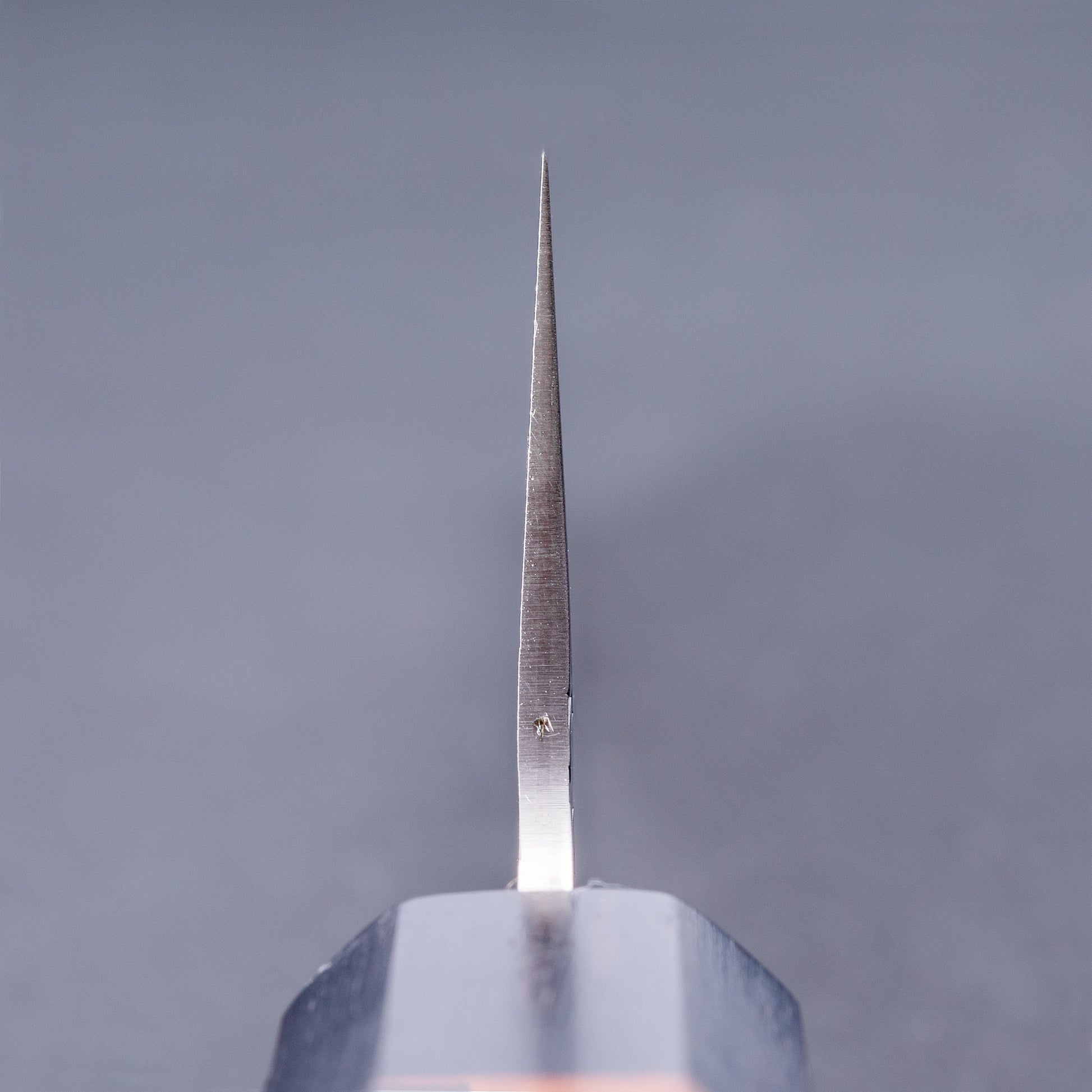 芯材の使用鋼材は今最も注目されている鋼材である粉末ハイス鋼の軟材のスーパーゴールド2(SPG2、SG2、R2)。 包丁用鋼材の中ではかなり硬度の高い鋼材なので、一度良い刃をつけると長切れします。