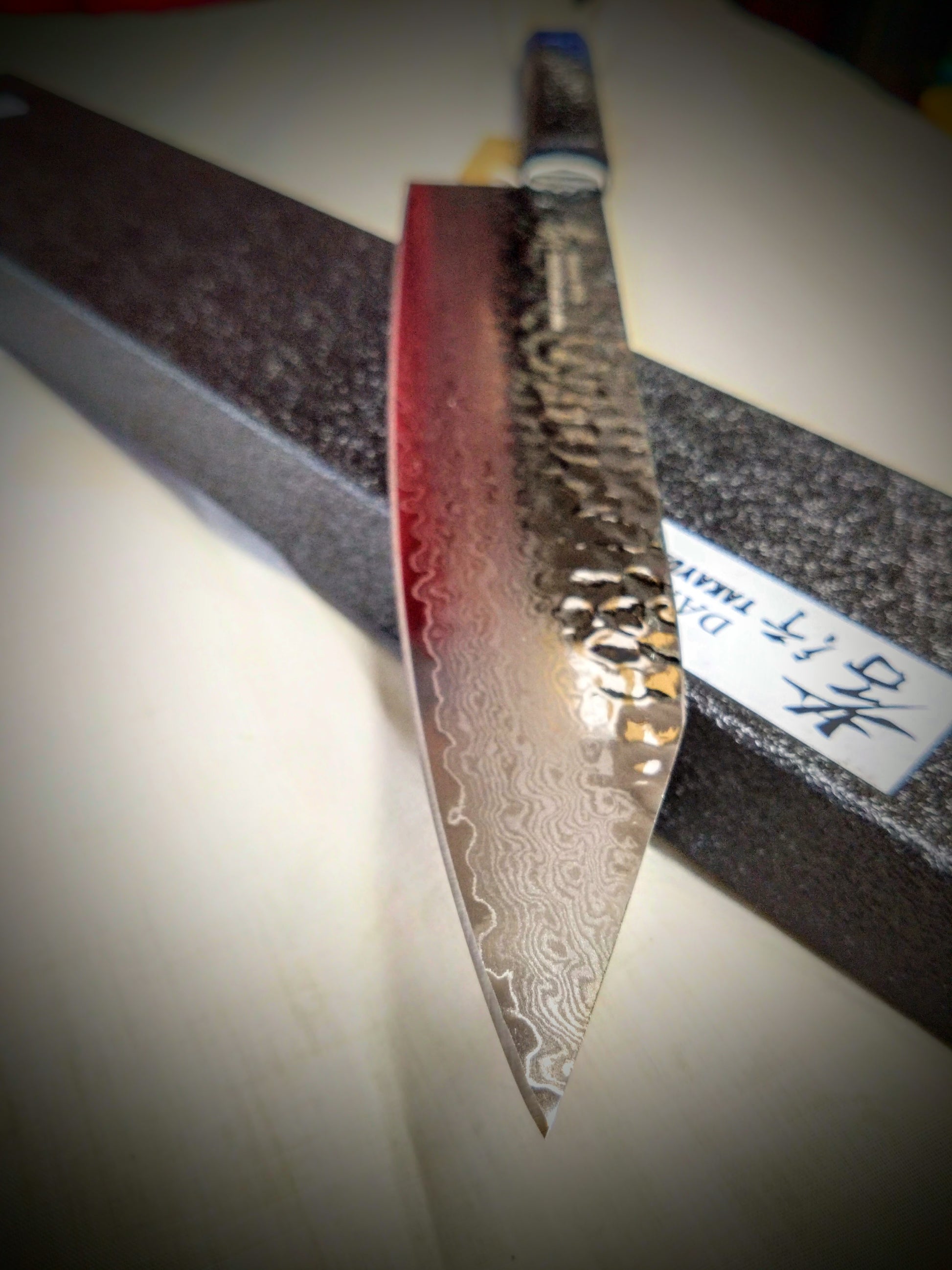 人気の『ダマスカス3槌層目シリーズ』に、水に強い耐久性の限界高い樫の木に優しい漆職人が漆塗りを施した柄を付けました。