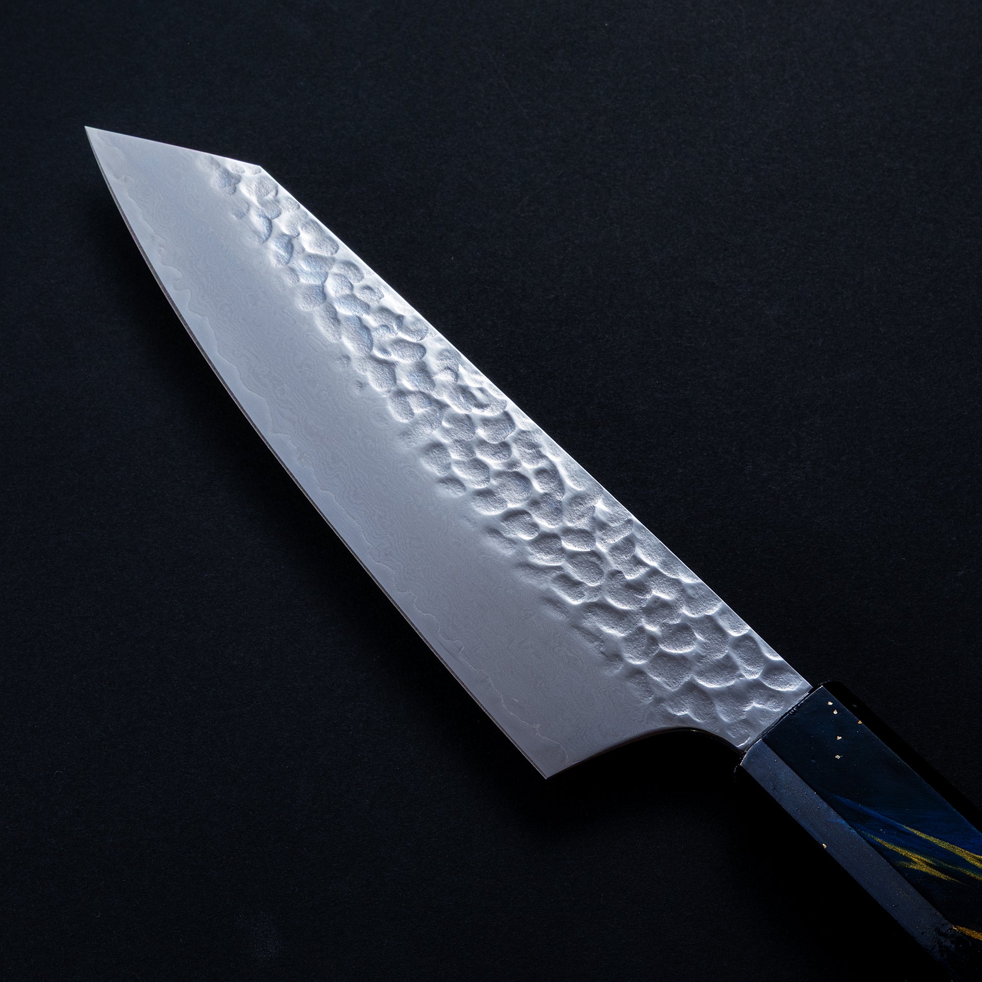 刃の表面には【槌目】と呼ばれるハンマーで叩いたような模様がついていますが、見た目のカッコ良さだけでなく食材を輪切りしたら、刃と食材の間に空気が入ることで切り離れを良くするという実用的な効果があります。