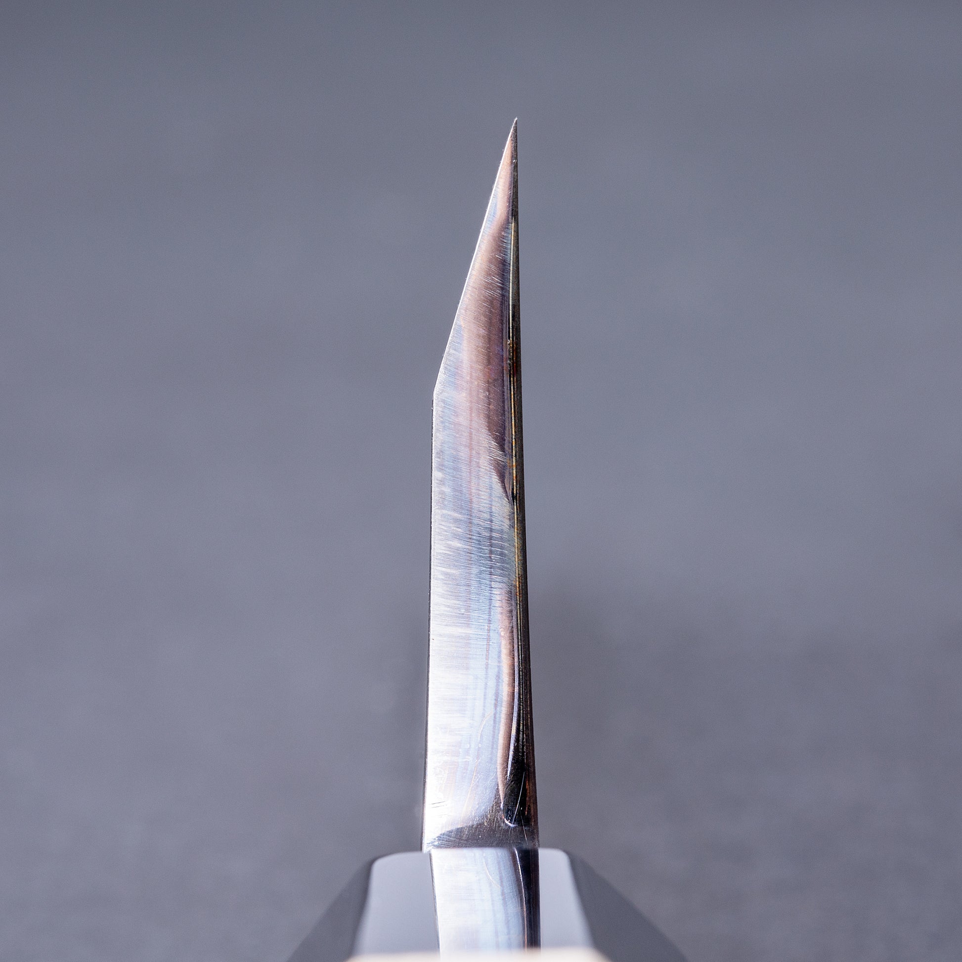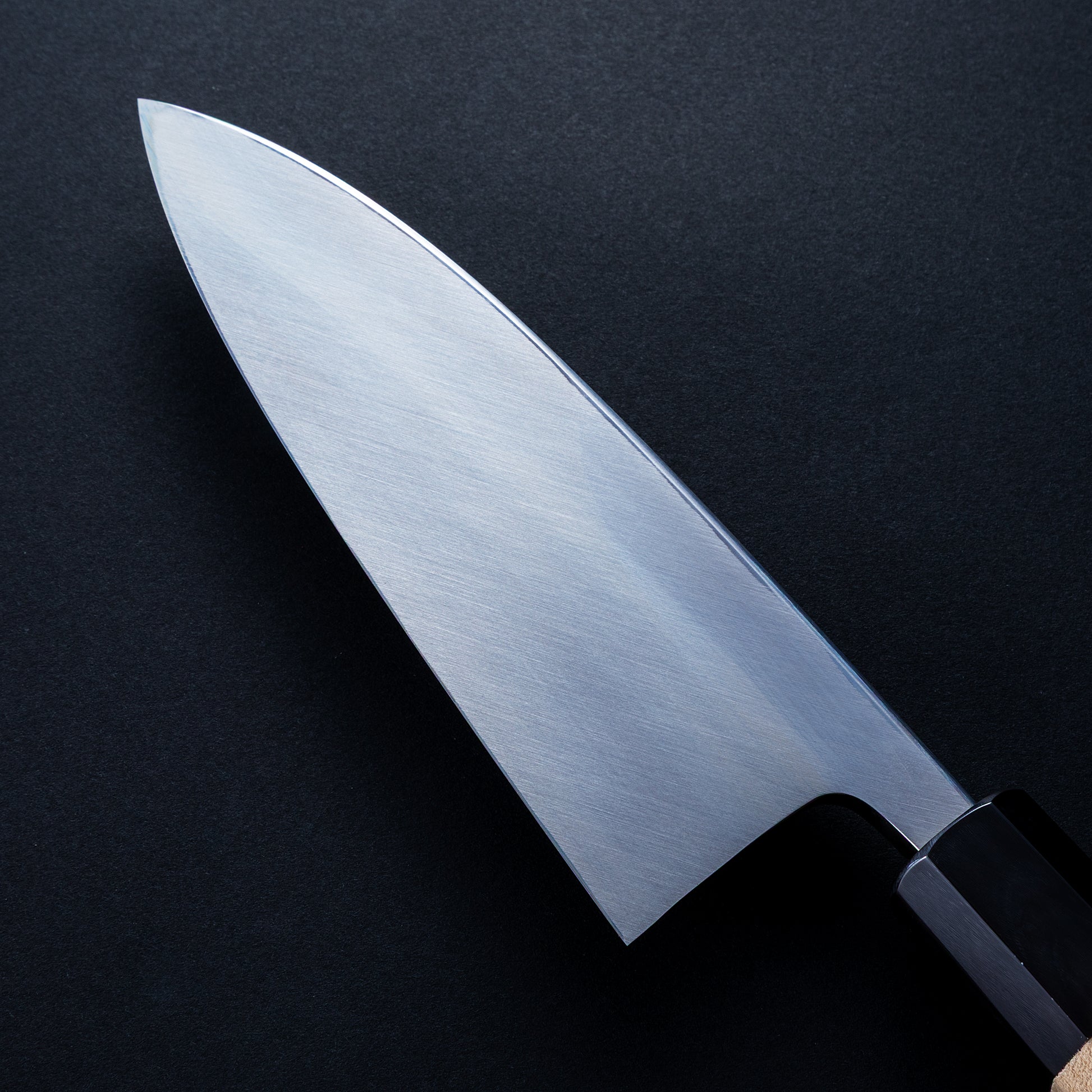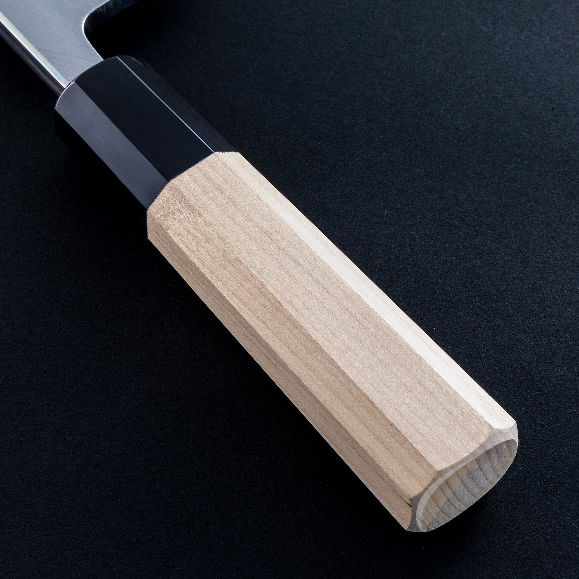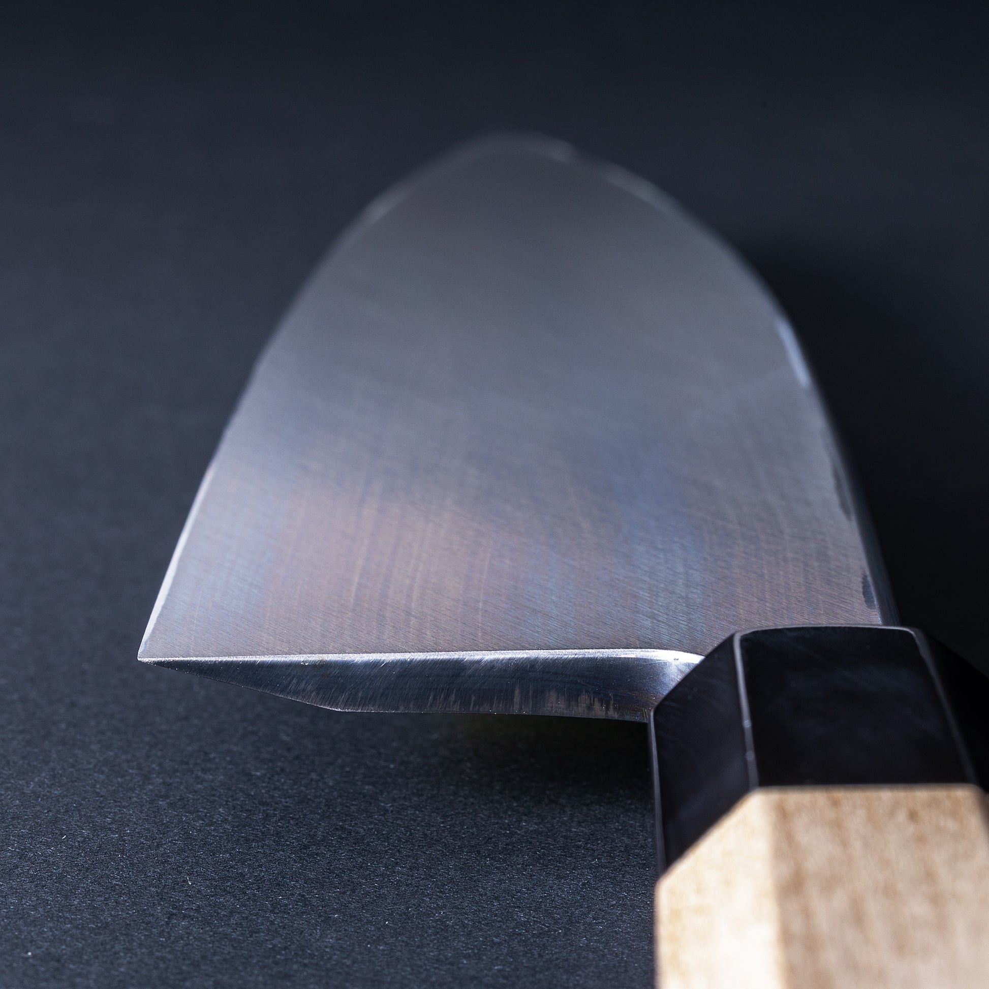 特筆すべきは出刃を握った際に人差し指が出刃の峰(背)に当たると思うのですが削ぎ棟(そぎむね)といって峰を面取りしているので長時間調理していても指が痛くなりにくい工夫がされています。
